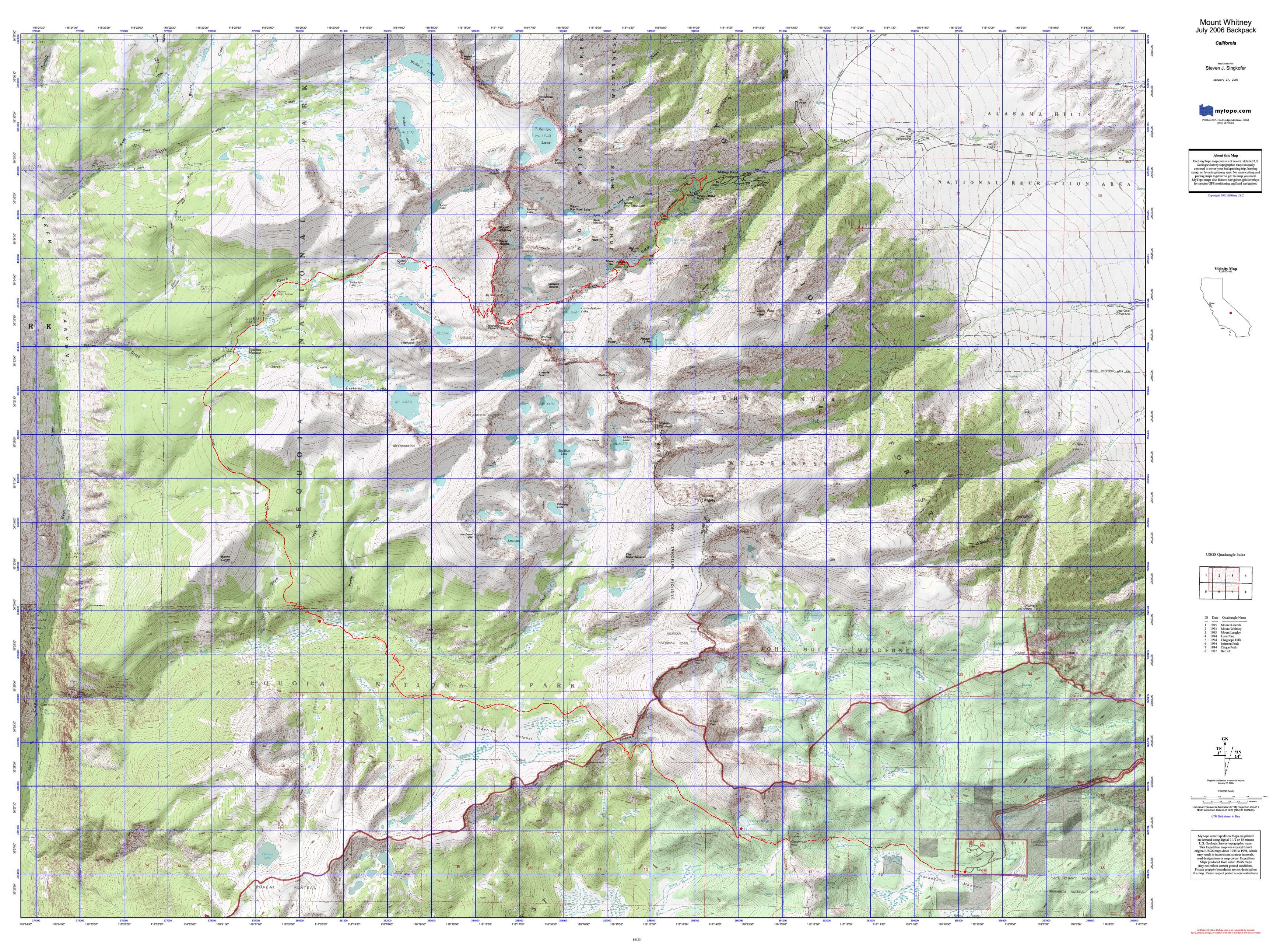 The photos were "borrowed" from the Internet. The hike profile and the map were created by Steve Singkofer. Most of the information on this page is directly excerpted from Mount Whitney - The Complete Trailhead-to-Summit Hiking Guide by Paul Richins, Jr., pages 134-142.